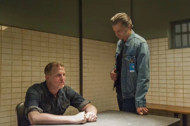 In the interview room, Raylan uncuffs Daryl and escorts him to the elevators, working at provoking the man who pleads that he's grieving for one dead brother and another "on his way to juvie" — "Nephew," Raylan corrects him — and "a sister I got to keep from losing her damned mind." Daryl is offended by Raylan's attitude toward him, but Raylan keeps on, laying out his own scenario of how he thinks Daryl went to Alison's to use her to draw him "over to show it down." "You mean, like cowboys?" Daryl scoffs. Raylan continues, postulating with certainty that when Daryl saw the news that it was Art instead of Raylan, he panicked and somehow convinced Kendal to take the fall for it. There are more bitter words exchanged, but the deputy marshal tells the Florida criminal that he's not going to kill him. "Your luck. You shot the one man makes a difference to me," but says that he's going to bring Daryl down anyhow. "That web of bullshit you spun around yourself, to protect yourself, I'm gonna use it to strangle the life out of you, take away everything you got. Then you're gonna wish I'd blacked you out with a bullet to the head." Daryl makes a vague threat against Raylan and leaves.